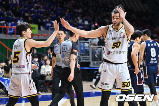 [OSEN=부산, 이석우 기자] 23일 부산 사직체육관에서 2025-2026 LG전자 프로농구 부산 KCC와 창원 LG의 경기가 열렸다. 허웅·송교창이 복귀한 KCC가 타마요·양홍석 이탈로 전력 공백이 생긴 LG를 상대로 길었던 LG전 10연패 탈출을 노린다. 창원 LG 아셈 마레이가 골을 성공시키고 양준석과 하이파이브를 하고 있다. 2026.01.23 / foto0307@osen.co.kr