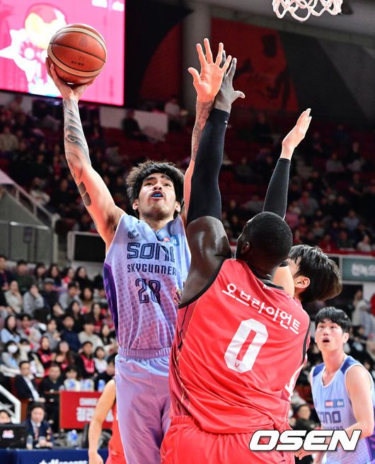 [OSEN=안양, 지형준 기자] 23일 오후 안양 정관장 아레나에서 2025-2026 LG전자 프로농구 안양 정관장과 고양 소노의 경기가 열렸다. 정관장은 2위(22승 11패), 소노는 7위(12승20패)를 기록중이다. 1쿼터 소노 켐바오가 슛을 시도하고 있다. 2026.01.23 /jpnews@osen.co.kr