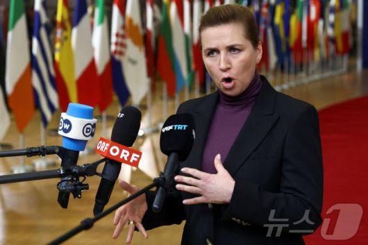 메테 프레데릭센 덴마크 총리가 22일 벨기에 브뤼셀에서 유럽연합(EU) 특별 정상회의 전 기자들과 만나 그린란드 관련 발언을 하고 있다. 2026.1.22 ⓒ 로이터=뉴스1 ⓒ News1 강민경 기자 |