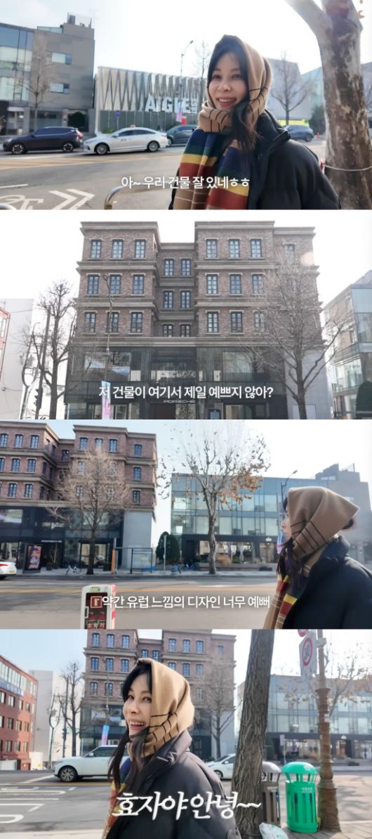 길을 걷던 중 건너편 위치한 자신의 한남동 건물도 만났다. 고소영은 "우리 건물 잘 있네"라며 "너무 예뻐. 저 건물이 여기서 제일 예쁘지 않아? 유럽 느낌의 디자인이 너무 예쁘다. 효자야 안녕~"이라고 인사해 눈길을 끌었다.