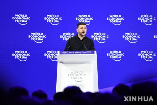 [다보스=신화/뉴시스] 볼로디미르 젤렌스키 우크라이나 대통령이 22일(현지 시간) 스위스 다보스에서 열린 세계경제포럼(WEF·다보스포럼)에서 연설하고 있다. 젤렌스키 대통령은 유럽 지도자들이 지난 한 해 동안 러시아의 우크라이나 침공에 대한 충분한 대응 조치를 취하지 않았다고 비판했다. 2026.01.23. |