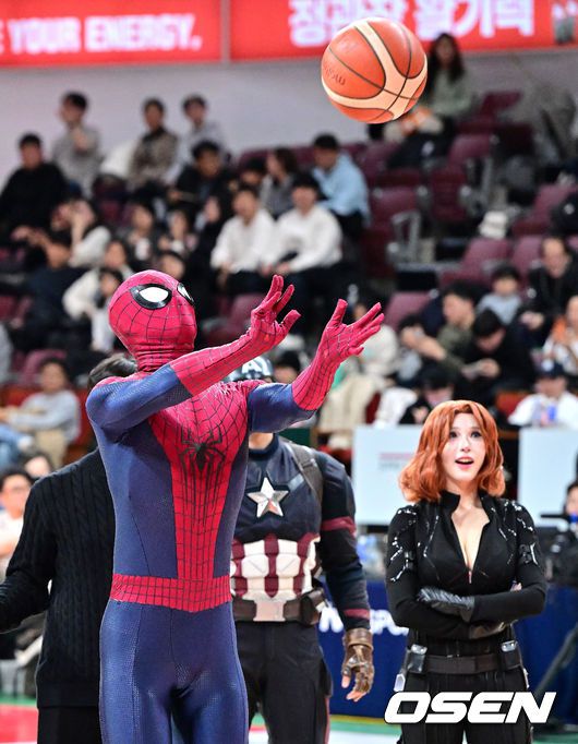 [OSEN=안양, 지형준 기자] 23일 오후 안양 정관장 아레나에서 2025-2026 LG전자 프로농구 안양 정관장과 고양 소노의 경기가 열렸다. 정관장은 2위(22승 11패), 소노는 7위(12승20패)를 기록중이다. 하프타임 스파이더맨이 팬들과 자유투 대결을 선보이고 있다. 2026.01.23 /jpnews@osen.co.kr