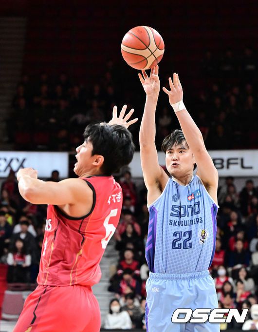 [OSEN=안양, 지형준 기자] 23일 오후 안양 정관장 아레나에서 2025-2026 LG전자 프로농구 안양 정관장과 고양 소노의 경기가 열렸다. 정관장은 2위(22승 11패), 소노는 7위(12승20패)를 기록중이다. 2쿼터 소노 임동섭이 정관장 박지훈의 수비를 피해 슛을 시도하고 있다. 2026.01.23 /jpnews@osen.co.kr