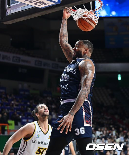 [OSEN=부산, 이석우 기자] 23일 부산 사직체육관에서 2025-2026 LG전자 프로농구 부산 KCC와 창원 LG의 경기가 열렸다. 허웅·송교창이 복귀한 KCC가 타마요·양홍석 이탈로 전력 공백이 생긴 LG를 상대로 길었던 LG전 10연패 탈출을 노린다. 부산 KCC 숀롱이 덩크슛을 성공시키고 있다. 2026.01.23 / foto0307@osen.co.kr