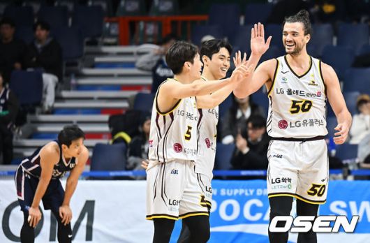 [OSEN=부산, 이석우 기자] 23일 부산 사직체육관에서 2025-2026 LG전자 프로농구 부산 KCC와 창원 LG의 경기가 열렸다. 허웅·송교창이 복귀한 KCC가 타마요·양홍석 이탈로 전력 공백이 생긴 LG를 상대로 길었던 LG전 10연패 탈출을 노린다. 창원 LG 마레이가 득점에 성공한 후 동료들과 기뻐하고 있다. 2026.01.23 / foto0307@osen.co.kr