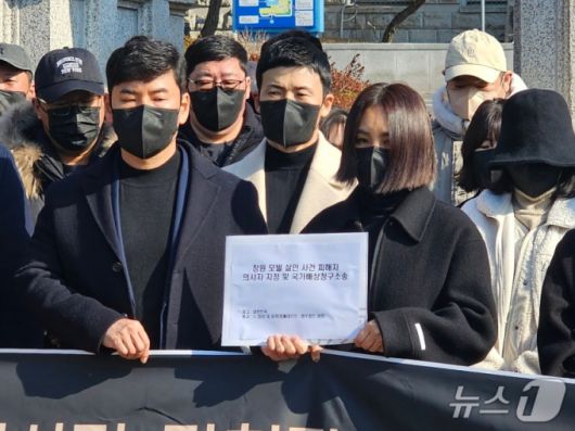 창원 모텔 흉기 난동 사건의 피해자 유족이 23일 창원지법 앞에서 기자회견을 열고 국가 상대 손배소 제기 취지를 설명하고 있다. 2026.1.23 /사진=뉴스1 |