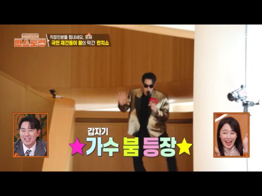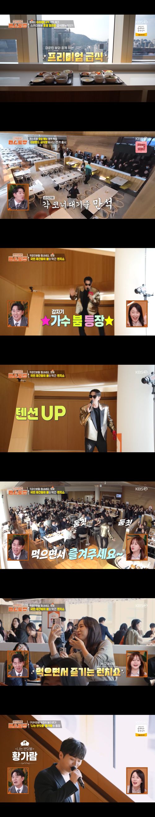직장인들이 메뉴를 받아 들고 만족스러운 표정으로 식사를 이어가던 중, 뜻밖의 음악이 구내식당에 울려 퍼졌다. 붐이 깜짝 공연을 선보이며 분위기를 단숨에 끌어올린 것. 구내식당이 순식간에 ‘디너쇼’ 모드로 바뀐 가운데, 예상치 못한 손님까지 등장해 현장을 뒤집었다.