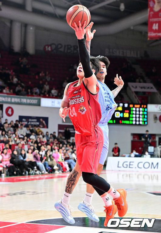 [OSEN=안양, 지형준 기자] 23일 오후 안양 정관장 아레나에서 2025-2026 LG전자 프로농구 안양 정관장과 고양 소노의 경기가 열렸다. 정관장은 2위(22승 11패), 소노는 7위(12승20패)를 기록중이다. 4쿼터 정관장 문유현이 소노 켐바오의 수비를 피해 레이업을 성공시키고 있다. 2026.01.23 /jpnews@osen.co.kr