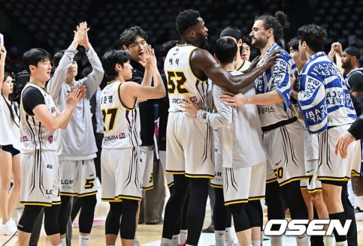 [OSEN=부산, 이석우 기자] 23일 부산 사직체육관에서 2025-2026 LG전자 프로농구 부산 KCC와 창원 LG의 경기가 열렸다. LG가 82-65로 KCC전 11연승을 올렸다. 창원 LG 선수들이 승리 기쁨을 나누고 있다. 2026.01.23 / foto0307@osen.co.kr