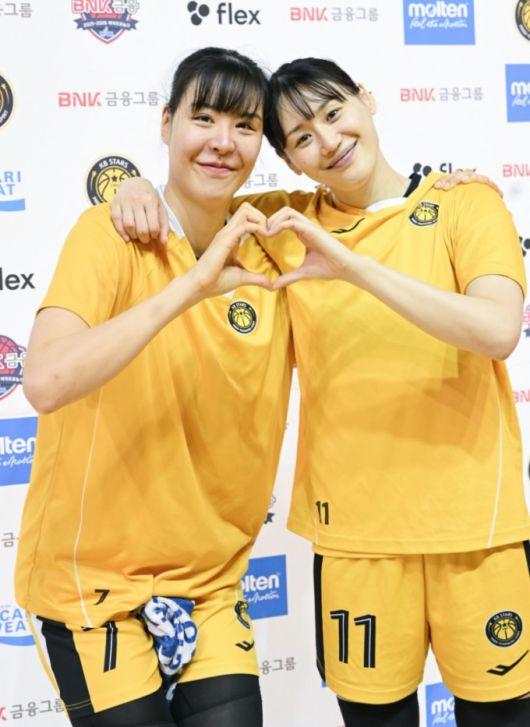 [서울=뉴스핌] 박상욱 기자 = KB 박지수(왼쪽)와 강이슬이 23일 2025-2026 여자프로농구 정규리그 BNK와의 홈 경기를 승리한 뒤 손을 모아 하트모양을 그리고 있다. [사진=WKBL] 2026.01.23 psoq1337@newspim.com |