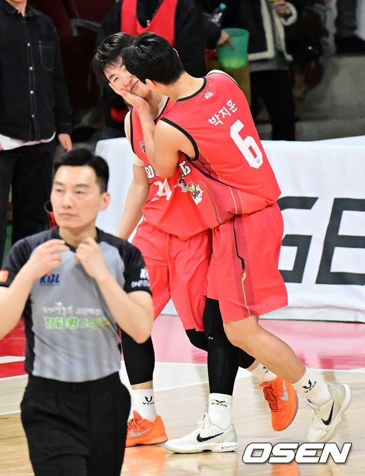 [OSEN=안양, 지형준 기자] 23일 오후 안양 정관장 아레나에서 2025-2026 LG전자 프로농구 안양 정관장과 고양 소노의 경기가 열렸다. 이날 정관장은 소노에 65-64 짜릿한 역전승을 거뒀다. 경기를 마치고 정관장 문유현이 박지훈과 승리를 기뻐하고 있다. 2026.01.23 /jpnews@osen.co.kr