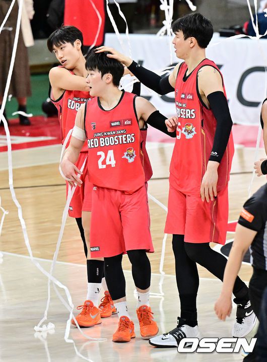 경기를 마치고 정관장 문유현이 동료선수들과 승리를 기뻐하고 있다. 2026.01.23 /jpnews@osen.co.kr