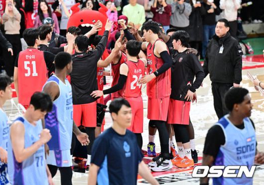 [OSEN=안양, 지형준 기자] 23일 오후 안양 정관장 아레나에서 2025-2026 LG전자 프로농구 안양 정관장과 고양 소노의 경기가 열렸다. 이날 정관장은 소노에 65-64 짜릿한 역전승을 거뒀다. 정관장 선수들이 승리를 기뻐하고 있다. 2026.01.23 /jpnews@osen.co.kr