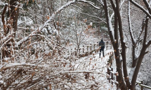 19일 경기도 수원시 영통구 한 공원에서 시민이 눈 쌓인 산책로를 걷고 있다. (사진= 연합뉴스) |