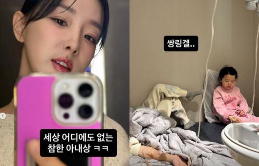 함께 공개된 사진에는 병원 침대에 누워 링겔을 맞고 있는 큰딸 태리의 모습이 담겼다. 이어 그 옆에서 나란히 링겔을 맞고 있는 엘리의 모습과 함께 "쌍링겔.."이라고 밝혀 안타까움을 자아냈다.