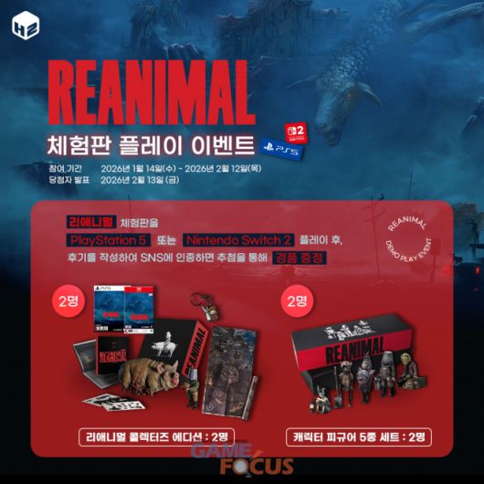(주)에이치투 인터렉티브(이하 H2 INTERACTIVE, 대표 허준하)는 ‘리틀 나이트메어’ I & II의 제작자 ‘Tarsier Studios’가 새롭게 선보이는 협동형 서바이벌 호러 게임 ‘리애니멀(Reanimal)’ 한국어판을 PS5 및 닌텐도 스위치 2로 정식 출시하며, 실물 패키지의 예약 판매를 오늘(1월 23일)부터 시작한다고 밝혔다.