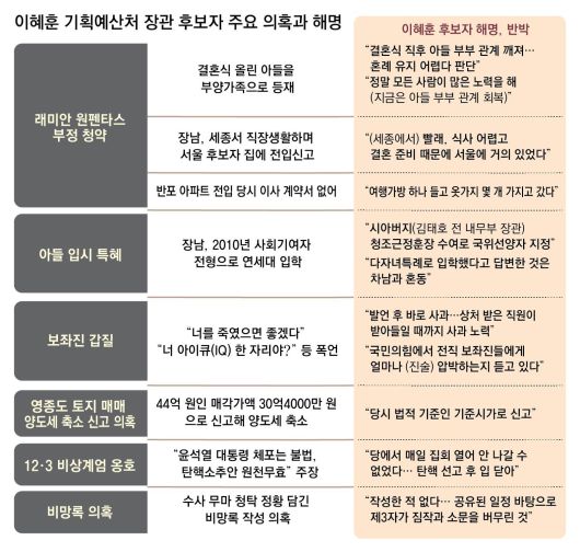 이 후보자는 이른바 ‘위장 미혼’ 의혹에 대해선 “(장남이) 관계가 깨지면서 생겨난 여러 가지 심리적, 정서적 문제로 발병해 지금도 치료를 받고 있다”고 말하며 눈물을 훔쳤다. 결혼 전 세종시에 전셋집을 두고도 이 후보자 집에 주소지를 둔 데 대해선 “세탁하고 빨래 이런 것들을 혼자 하기가 힘들었다”고 했다.