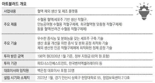 2023년 정부는 복지부·과기부·산업부·식약처·질병청이 참여하는 ‘세포기반 인공혈액 기술개발사업단’을 출범시켰다. 5년간 471억 원을 투입하는 1단계 사업이다. 아트블러드는 사람에게 수혈하는 적혈구 제제를 대량생산하는 핵심 과제를 단독 수주했다. 같은 해 차세대 유망 초기(seed) 기술 실용화 패스트트랙 사업 과제를 수주해 개에게 수혈할 수 있는 적혈구를 세계 최초로 생산하는 데도 성공했다.