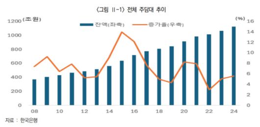 24일 한국금융연구원에 따르면 2024년 말 기준 민간 금융회사의 주담대 규모는 약 1124조원으로, 전체 민간 가계대출(1806조원)의 약 62%를 차지했다. 가계대출에서 주담대 비중이 절대적으로 높은 구조가 고착화된 상태다.