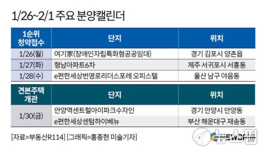 [서울=뉴스핌] 정영희 기자 = 24일 부동산R114에 따르면 1월 넷째 주에는 전국 3개 단지에서 총 184가구(일반분양 156가구)가 공급된다. 경기 김포시 양촌읍 '여기家(장애인자립특화형공공임대)'와 제주 서귀포시 서홍동 '형남아파트6차'에서 청약을 진행한다. 견본주택은 안양시 안양동 '안양역센트럴아이파크수자인'과 부산 해운대구 재송동 'e편한세상센텀하이베뉴' 등 2곳이 오픈 예정이다.