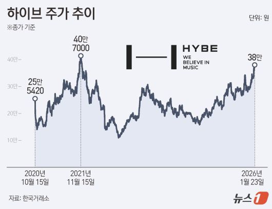 24일 한국거래소에 따르면 전날 하이브는 전 거래일 대비 1만 1500원(3.12%) 오른 38만 원에 거래를 마쳤다. 장중 한때 39만 3500원까지 오르며 지난 2021년 11월 25일 이후 약 4년 2개월 만에 최고가를 기록했다.