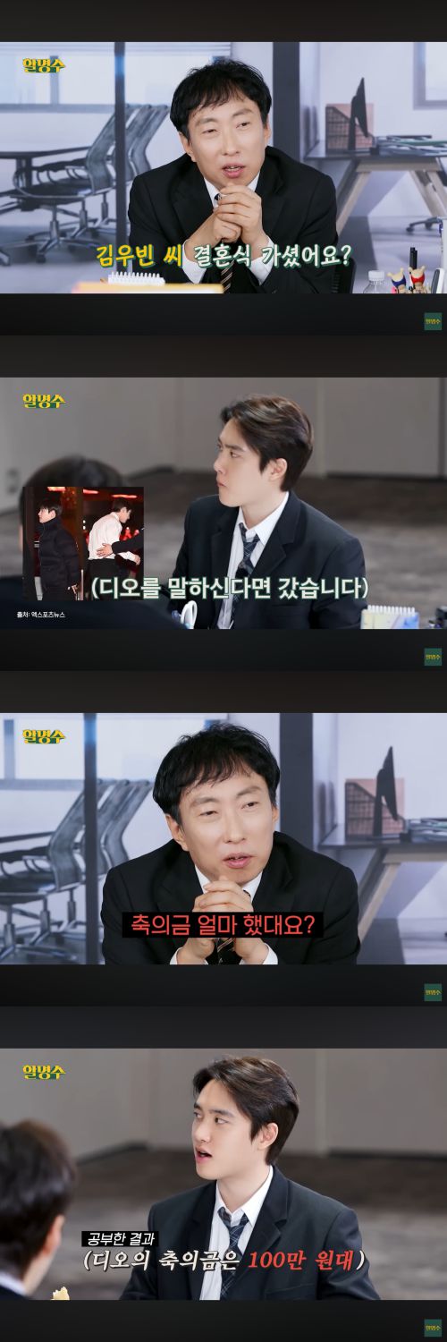 이와 관련해 디오는 “스케줄 때문에 오래 머물지는 못했다”고 설명했다. 이를 듣던 박명수는 “그래서 축의금은 얼마 했느냐”고 질문하며 분위기를 띄웠고, 디오는 “100만 원대였다”고 솔직하게 답해 웃음을 자아냈다.