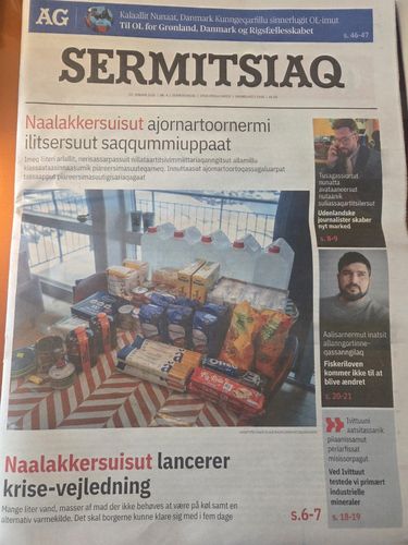 식량과 연료 등 생필품을 비축하라는 그린란드 정부 권고가 나온 뒤 현지 최대 일간 '세르미치악'('산'이라는 뜻)은 5일분 식량의 예시 사진과 관련 기사를 1면에 실었다.