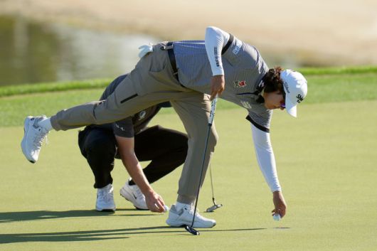 [라킨타=AP/뉴시스] 김성현이 23일(현지 시간) 미 캘리포니아주 라킨타의 라킨타 컨트리클럽에서 열린 미국프로골프(PGA) 투어 아메리칸 익스프레스 2라운드 18번 홀에서 버디를 기록한 후 공을 집어 들고 있다. 첫날 공동 3위였던 김성현은 중간 합계 15언더파 129타 공동 4위를 기록했다. 2026.01.24.