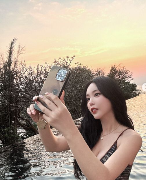 홍진영은 "수영장에서 사진만 찍기. 물에 들어가진 않음"이라며 너스레를 떨었다.