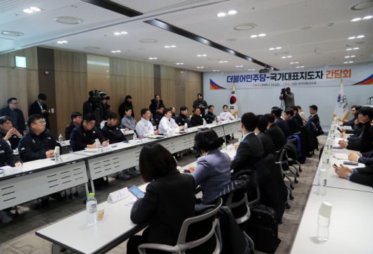 정청래 더불어민주당 대표와 당 지도부가 국가대표지도자들과 간담회에서 국가대표 선수-지도자들의 염원이 담긴 사인 태극기를 들고 기념사진을 찍고 있다 |