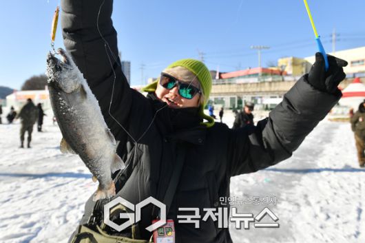 (화천=국제뉴스) 최옥현 기자 = 23일 화천산천어축제장을 찾은 관광객들이 얼음낚시를 즐기고 있다.
