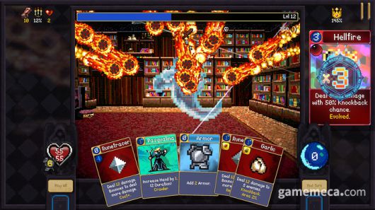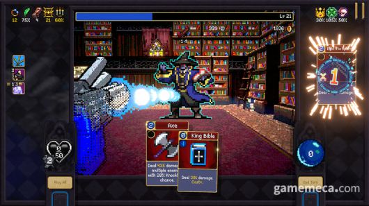 카드의 효과 역시 뱀파이어 서바이버에서 영감을 받았다. '미치광이의 두개골'은 적을 강하게 만드는 대신 획득 경험치를 늘려주고, 매혹구는 카드를 드로우한다. 무기를 진화시키는 핵심 시스템 역시 구현되며, 카드에 다양한 효과를 지닌 보석을 장착하는 강화 요소도 더해진다. 보석에는 사용 코스트가 늘어나는 간단한 것부터, '이 카드가 손에 있을 시 모든 공격에 대미지 추가'와 같은 독특한 효과도 있다.