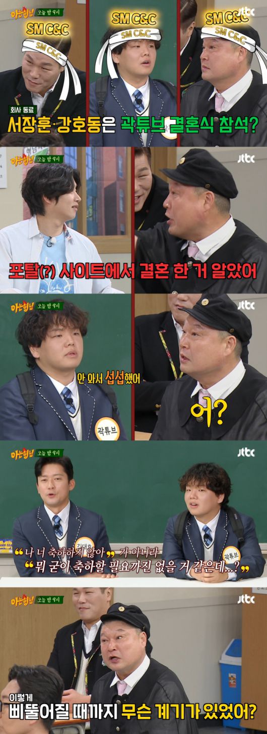 SM C&C 소속인 곽튜브는 같은 소속사 동료인 강호동, 서장훈도 결혼식에 참석했냐는 질문에 "오늘 처음 본다. 회사 들어온 지 1년 3개월 됐는데 처음 봤다"고 답했다. 그러자 강호동은 "포털 사이트 보고 결혼한 거 알았다. 가고 싶었는데 초대도 안 했는데 결혼식에 가면 곽튜브가 얼마나 놀랐겠냐"고 설명했다.
