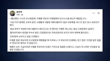 송언석 원내대표는 오늘(24일) SNS에서 '10년 규모의 본인 사생활이 담긴 비망록을 보좌진이 썼다', '장남 부부가 파경 위기라 혼인신고는 안 했지만, 며느리는 신혼집에 살았다' 는 이 후보자의 해명을 나열한 뒤 이같이 밝혔습니다.