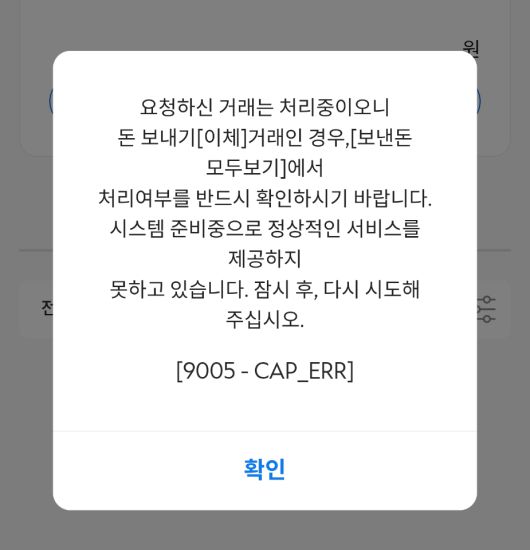 이체를 시도할 경우 “시스템 준비 중으로 정상적인 서비스를 제공하지 못하고 있다”며 재시도를 요청하는 안내 문구가 표시됐습니다.