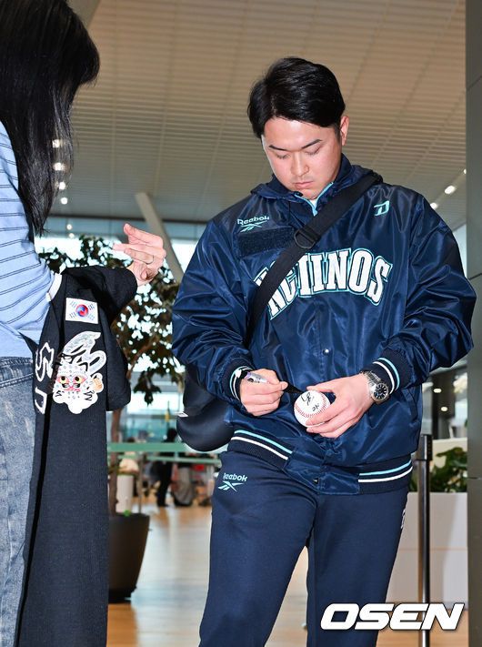 [OSEN=인천공항, 민경훈 기자] 프로야구 NC 다이노스가 스프링캠프를 위해 24일 오후 인천국제공항을 통해 미국 LA로 출국했다. NC 스프링캠프 본진은 로스앤젤레스에 도착한 후 미국 국내선을 경유해 애리조나 투손으로 이동할 예정이다. NC 토다 나츠키가 출국길에 오르며 팬에게 사인을 해주고 있다. 2026.01.24 / rumi@osen.co.kr