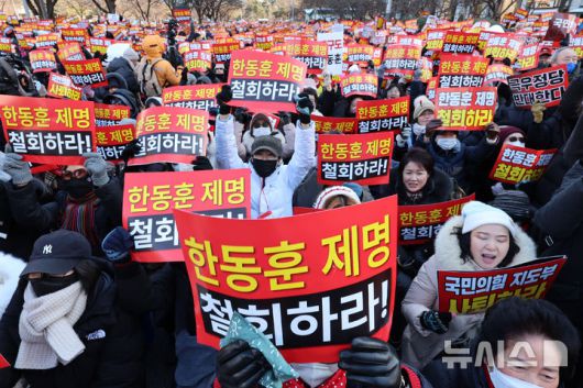 [서울=뉴시스] 조성우 기자 = 한동훈 전 국민의힘 대표 지지자들이 24일 오후 서울 영등포구 국회의사당역 인근에서 열린 한 전 대표 징계 철회 촉구 집회에서 구호를 외치고 있다. 2026.01.24. xconfind@newsis.com
