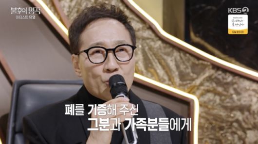 이에 유열은 "제가 9년 전부터 폐섬유증이 진행이 되다가, 재작년 5월에 독감으로 입원을 했는데, 그길로 6개월 정도 중환자실 병원에 있었다. 나중에는 생명이 위중한 지경까지 갔었다"라고 회상했다.