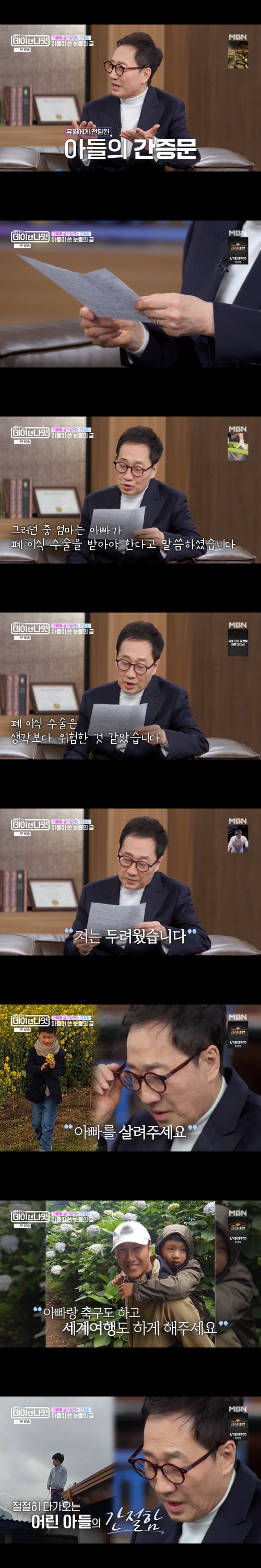 이어 아들은 “수술이 너무 위험해 보여 무서웠다”며 “그날부터 한 달 동안 엄마와 새벽 예배에 가서 ‘아빠를 살려주세요. 아빠랑 축구도 하고 세계 여행도 하게 해주세요’라고 매일 기도했다”고 적었다. 또 잠들기 전에도 엄마와 함께 “하나님, 아빠를 살려주세요”라고 기도했다는 대목이 공개되며 스튜디오는 숙연해졌다.