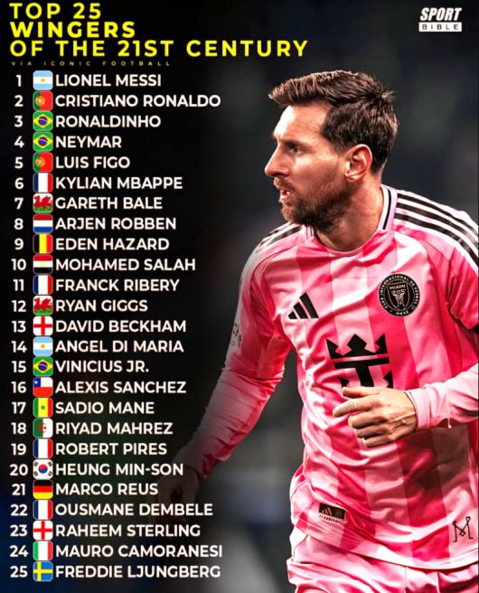 매체에 따르면 '스포츠 바이블'은 21세기에 활약한 윙어들 중 가장 뛰어난 활약을 펼친 선수 25명을 선정해 순위를 매겼다.