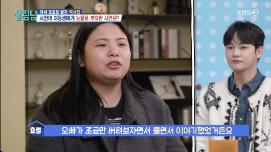 동생의 눈물 섞인 고백에 박서진이 보인 반응은 예상 밖이었다. 평소 무뚝뚝하던 오빠가 동생을 붙잡고 같이 울기 시작한 것. 효정 씨는 “오빠가 조금만 버텨보자면서 울면서 이야기를 했었거든요. 오빠가 한 가지를 이렇게 오래 잡고 있는 것도 동생으로서는 신기하거든요. 오빠가 놓치기 싫은 프로그램이었던 것 같아요”라며 박서진의 간절했던 태도를 떠올렸다.