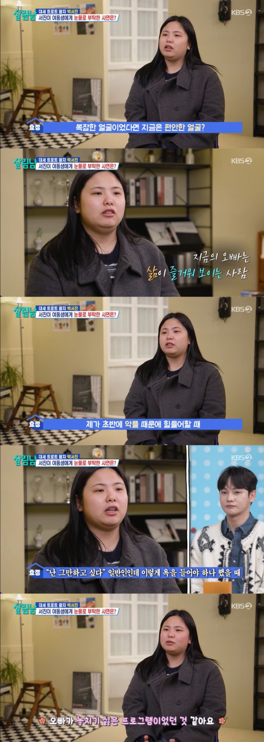 박서진이 이토록 ‘살림남’에 절실했던 이유는 동생의 눈을 통해 증명됐다. 효정 씨는 “오빠 얼굴 표정부터 달라졌다. 예전에는 진짜 삶을 다 잃은 것처럼 보였거든요. 복잡한 얼굴이었다면 지금은 편안한 얼굴”이라며, 오빠가 방송을 통해 세상 밖으로 나오고 웃음을 되찾은 모습에 결국 자신의 상처보다 오빠의 행복을 택했음을 밝혔다.