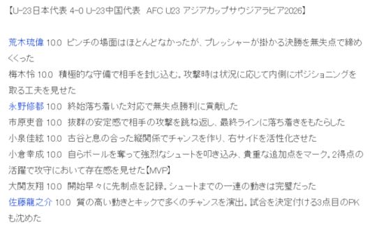 풋볼 채널은 "중국전에서 출전한 선수들과 감독의 퍼포먼스를 어디보다 빠르게 채점한다"라며 평점표를 공개했는데, 결과는 전원 10.0이었다. 골키퍼 아라키 루이부터 최전방 공격수 은와디케 브라이언, 교체로 들어간 선수들, 그리고 오이와 고 감독까지 예외는 없었다.