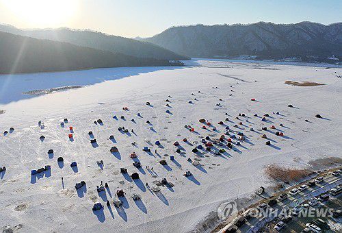 (춘천=연합뉴스) 양지웅 기자 = 연일 강추위가 이어지는 25일 '빙박 명소'로 알려진 강원 춘천시 사북면 지촌리 인근의 얼어붙은 북한강 위로 캠핑을 즐기는 시민들의 텐트가 모여 있다. 2026.1.25