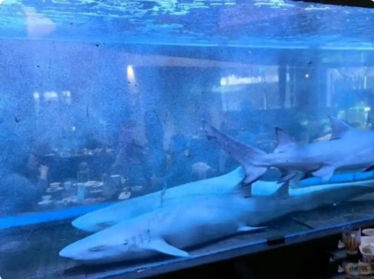 이 식당은 원래 펭귄 전시로 온라인에서 화제가 된 곳이다. 현재는 펭귄 없이 상어만 남아 있으며, 많은 손님들이 사진을 찍는 일종의 ‘포토존’으로 소비되고 있다.