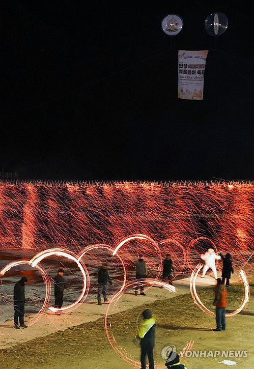 (단양=연합뉴스) 김형우 기자 = 지난 24일 저녁 충북 단양군 대강면 '제1회 단양 겨울놀이' 축제장에서 열린 쥐불놀이와 낙화놀이가 겨울밤을 환하게 밝히고 있다. 2026.1.25 [단양군 제공. 재판매 및 DB 금지]