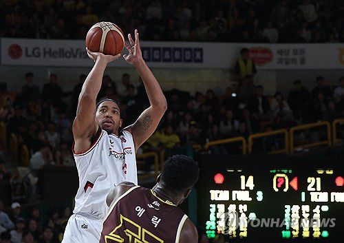 (창원=연합뉴스) 김동민 기자 = 25일 경남 창원체육관에서 열린 2025-2026 LG전자 프로농구 정규리그 창원 LG 세이커스와 안양 정관장 레드부스터스의 경기. 정관장 브라이스 워싱턴이 슛하고 있다. 2026.1.25