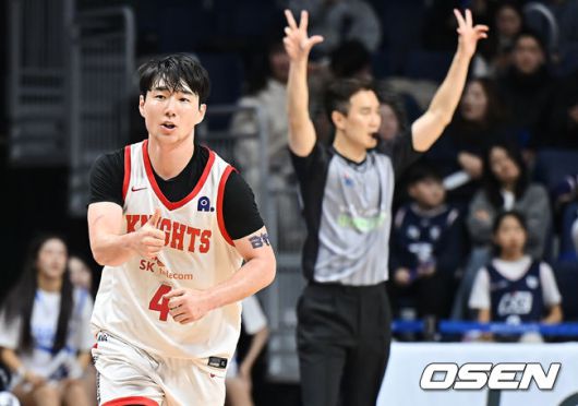 [OSEN=부산, 이석우 기자] 25일 부산 사직체육관에서 2025-2026 LG전자 프로농구 부산 KCC와 서울 SK의 경기가 열렸다. 부상자 복귀에도 완전한 경기력을 회복하지 못한 KCC와 강행군 속 주전 안영준까지 이탈한 SK가 정상 전력이 아닌 상태로 맞대결을 펼친다. 서울 SK 김낙현이 3점슛을 성공시키고 엄지척을 하고 있다. 2026.01.25 / foto0307@osen.co.kr