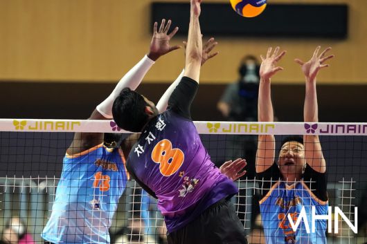 (MHN 춘천, 박태성 기자) 25일 춘천 호반체육관에서 '진에어 2025~2026 V-리그 올스타전'이 열렸다. 현대건설 양효진이 역대 최다 17번째 올스타 무대에 오르고, 한국전력 신영석은 6시즌 연속 팬투표 1위로 출전했다. 차지환이 경기를 펼치고 있다. <저작권자 Copyright ⓒ MHN / 엠에이치앤 무단전재 및 재배포 금지>