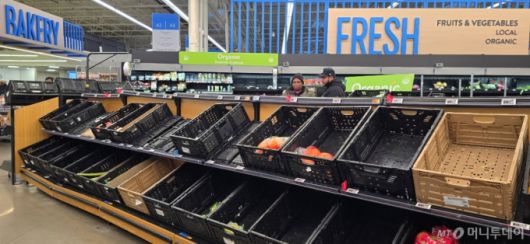 24일(현지시간) 미국 뉴저지주 월마트 매장에서 과일 진열대가 텅 비어 있다. /사진=심재현 특파원 |
